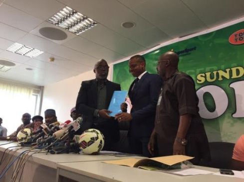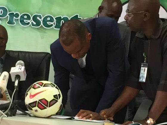 Sunday Oliseh today signed contract to become the new Super Eagles of Nigeria coach. He signed a contract with the NFF which ties him to the Super Eagles until 2020 thus becoming the fifth player in the 1994 class to handle the senior national team after Austin Eguavoen, Samson Siasia, Daniel Amokachi and Stephen Keshi. “It’s a great honour to be coach of this great national team,” said Oliseh at the unveiling ceremony in Abuja. “I’m not coming as a messiah. I’m coming as a man who wants to serve his country and give 150%. “Gone are the days when we had individual players who can win games on their own. But we have potential,” he said. He also laid down the law to players of Nigerian origin on his requirements before they can feature for his team. “No player outside of first division in Nigeria or elsewhere will play for the Super Eagles. We will work together with the technical committee because if we fail, they fail,” he concluded.
