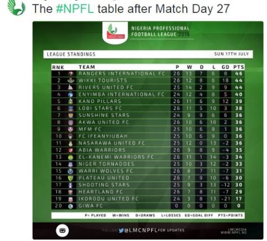Nigerian Premier League table as at now…. Jul18 Enugu Rangers are back to the top after their 3-2 away win at Akwa United on Saturday. Share this: Click to share on X (Opens in new window) X Click to share on Facebook (Opens in new window) Facebook Click to share on Pinterest (Opens in new window) Pinterest Click to share on WhatsApp (Opens in new window) WhatsApp More Click to print (Opens in new window) Print Click to share on LinkedIn (Opens in new window) LinkedIn Click to share on Reddit (Opens in new window) Reddit Click to share on Tumblr (Opens in new window) Tumblr Click to share on Pocket (Opens in new window) Pocket Click to share on Telegram (Opens in new window) Telegram Click to email a link to a friend (Opens in new window) Email Like Loading... Related