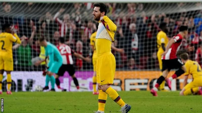 Barcelona’s hopes of reaching a seventh successive Copa del Rey final have ended at the quarter-final stage with defeat by Athletic Bilbao. The tight contest was decided in the third minute of stoppage time when Spanish forward Inaki Williams headed past Marc-Andre ter Stegen. Barcelona captain Lionel Messi wasted a good late chance when he fired at the legs of Athletic goalkeeper Unai Simon. There was another cup shock earlier when Real Madrid lost to Real Sociedad.