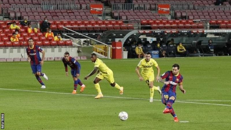 Ansu Fati was the game’s outstanding player and scored Barca’s first two goals, with a first-time finish from a Jordi Alba ball and then a low drive from Philippe Coutinho’s pass. He won the penalty which Messi scored. Barca had the game wrapped up by half-time as Pau Torres turned Messi’s cross into his own net. Unai Emery’s Villarreal offered little opposition, with their only shot on target coming in the final minute. Messi is the sixth player to score a goal in 17 different La Liga seasons, joining Real Madrid’s Sergio Ramos, who joined that club on Saturday. It was Messi’s first game since trying to leave his only club in the summer. Messi, 33, submitted a transfer request – claiming he was allowed to leave for free because of a clause in his contract – but Barca said he could not leave for less than 700m euros. He reluctantly announced he would stay because no team would pay that price, and he did not want to take the club to court. He started in the centre but played on the right and left in a flexible front line. He had a total of seven shots in the game, forcing Sergio Asenjo into three saves as well as his penalty goal. Koeman replaced Quique Setien, who was sacked after Barca failed to win the league and then lost 8-2 to Bayern Munich in the Champions League. Coutinho, who scored twice in that game for Bayern, was back in Barca’s starting line-up after returning from a loan spell. Summer signings Miralem Pjanic, Francisco Trincao and Pedri all made their debuts in the second half.