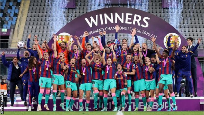 Chelsea trailed 33 seconds in when an attempted clearance hit Melanie Leupolz and went in for an own goal, and Alexia Putellas’ penalty made it 2-0. Aitana Bonmati finished an intricate move and Caroline Graham Hansen tapped in to put a rampant Barca out of sight. Despite a spirited second-half display there was no way back for the Blues. Barcelona become the first club to win both the men’s and women’s Champions League, and this was the biggest ever winning margin in a women’s final. Emma Hayes’ Chelsea side had hoped to add a European crown to their Women’s Super League and League Cup triumphs this season, as they looked to become only the second English side in history, after Arsenal in 2007, to complete the quadruple. In the first attack of the game Lieke Martens struck the bar for the Spanish champions from outside the box and from a subsequent cross Fran Kirby’s attempted clearance rebounded off team-mate Leupolz and freakishly looped in over goalkeeper Ann-Katrin Berger. Chelsea’s Pernille Harder missed a golden chance to level, shooting over when unmarked from Jess Carter’s deep cross, and they were punished as Leupolz caught Jennifer Hermoso with her trailing leg in the box and Putellas calmly sent Berger the wrong way from the spot. Putellas then played a wonderful first-time pass for Bonmati to slot home a third inside 20 minutes before Martens beat Niamh Charles and showed composure to pick out Hansen for well-worked fourth goal. Chelsea were high on endeavour after the break but failed to create any notable chances, while Barca’s Asisat Oshoala had a last-gasp goal ruled out for offside.